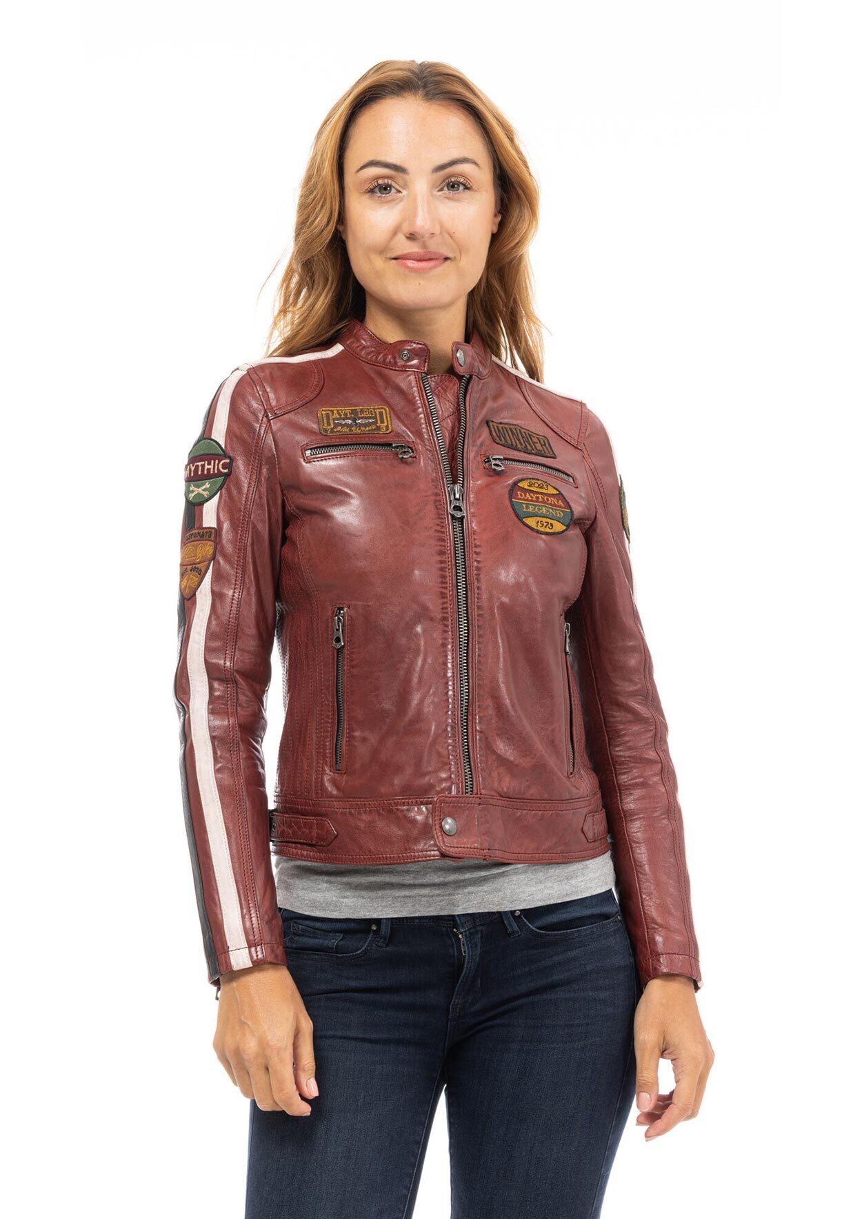 Comment résister à ce splendide blouson en cuir d'agneau pour femme. Vraiment tendance, original, de part sa coupe esprit motard , ses jeux de couleurs, ses écussons, empiècements .. On lui retrouve une coupe esprit motard, avec son petit col mao, ses bandes de cuirs colorés . Mais nous gardons un coté plus ville car le cuir est souple, confortable, sans coque et ajusté au corps pour plus de féminité . En effet, il s'agit d'un cuir en agneau , souple, assez fin, idéal pour la mi saison . De plus , sa doublure reste elle aussi assez légère,en coton et polyester, confortable , avec deux poches intérieures , pratique pour vos effets personnels . On aime , ses nombreux détails qui lui apportent originalité, modernité, etc , avec ses écussons, ses bandes cuirs sur le haut des manches . Le blouson cuir se ferme à l'aide d'un zip, possède des poches zippées en poitrine et deux poches biais . Vous avez des zips d'aisance en bas de manche, plus sympa , le blouson se prête bien au corps, plus dynamisant .