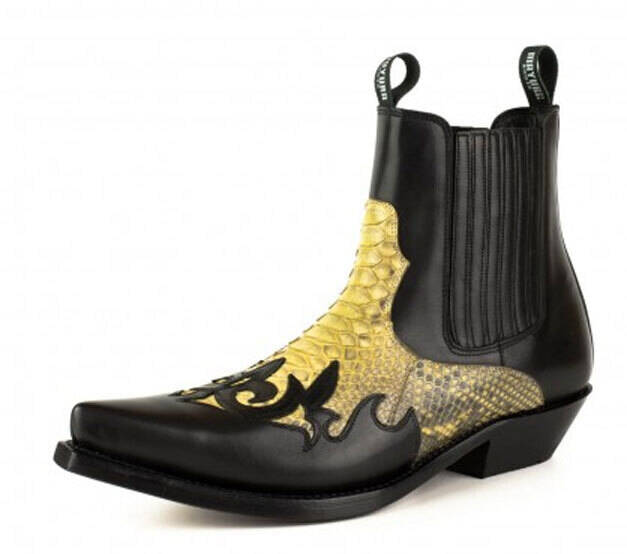 Boots en cuir de la marque Mayura .Fabriqué en cuir de vachette noir avec du python naturel, de couleur camel aspect vieilli et fini à la main. Avec semelle en cuir et fabriqué à la main avec le système de couture GOODYEAR, qui garantit la durabilité de la chaussure et un excellent confort.HAUTEUR DU TALON 3 cms