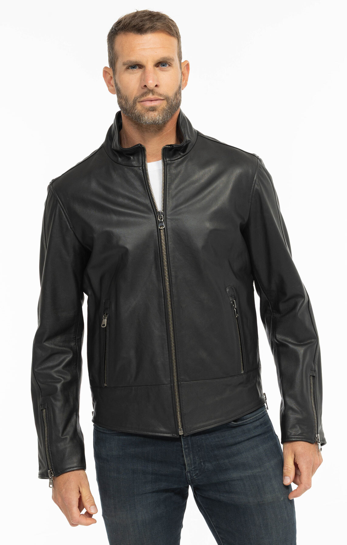 Blouson de cuir en agneau noir pour homme. On retrouve une coupe regular et un style classique, chic et intemporel à la fois qui peut se porter avec une tenue décontractée comme un tee-shirt et un jeans ou une tenue plus classique comme un pantalon coton et une chemise. Le blouson cuir possède un col debout, 2 poches zippées au niveau de la taille, des fermetures d'aisance sur les côtés du blouson cuir et une finition avec fermeture sur l'arrière des manches. Il se ferme à l'aide d'une fermeture éclair centrale et s'ouvre sur une doublure polyester et viscose avec 2 poches intérieures (1 avec fermeture et l'autre avec bouton). Le cuir d'agneau pour se modèle est plus épais que d'habitude mais on ressent un confort agréable et une sécurité au niveau de l'épaisseur. Comptez une longueur de corps de 61 cm pour une taille L.