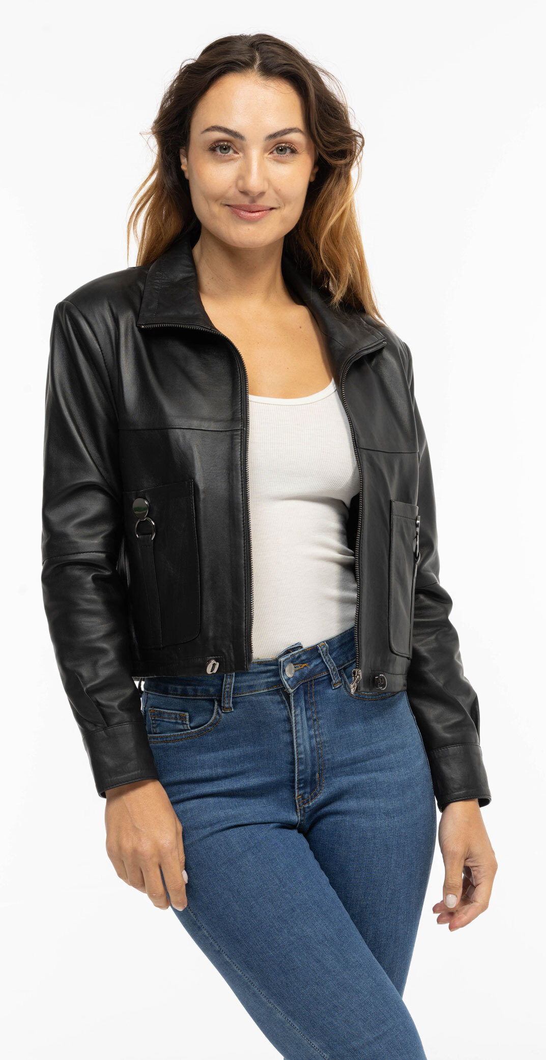 Blouson de cuir en agneau noir pour femme. On retrouve une pièce originale, chic et tendance à la fois. Le blouson de cuir possède un col debout, rabattable en col chemise avec un lien de resserrage. Vous avez 2 poches plaquées décoratives avec ouverture sur le côté et pression sur la partie haute. Le blouson cuir se ferme à l'aide d'une fermeture éclair centrale et vous pouvez resserrer le bas du blouson grâce au cordon. A l'intérieur, vous avez une doublure synthétique, sans poches intérieures. Comptez une longueur de corps de 53 cm pour une taille L.