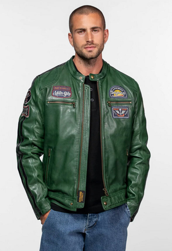 Blouson cuir homme de la collection Daytona dans un look branché , moto. Mélange parfait de style rétro et de performance, ce blouson motard en cuir de mouton au tannage végétal est orné de patchs customisés, esprit moto vintage aux bras et à la poitrine, ajoutant une touche authentique à votre tenue. Il possède une coupe ajustée mettant en avant votre silhouette. Vous avez un petit col motard avec bouton pression, des bandes latérales décoratives surpiquées aux bras. Le blouson cuir est doublé en coton au niveau du corps avec manches en polyester . Vous avez 4 poches extérieures zippées et 3 poches intérieures : à zip, pression et pour le téléphone.
