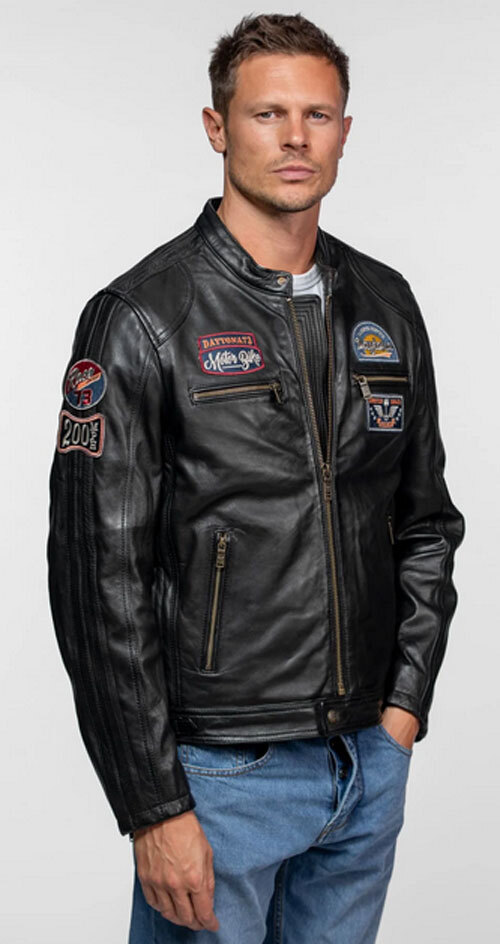 Blouson cuir homme de la collection Daytona dans un look branché , moto. Mélange parfait de style rétro et de performance, ce blouson motard en cuir de mouton au tannage végétal est orné de patchs customisés, esprit moto vintage aux bras et à la poitrine, ajoutant une touche authentique à votre tenue. Il possède une coupe ajustée mettant en avant votre silhouette. Vous avez un petit col motard avec bouton pression, des bandes latérales décoratives surpiquées aux bras. Le blouson cuir est doublé en coton au niveau du corps avec manches en polyester . Vous avez 4 poches extérieures zippées et 3 poches intérieures : à zip, pression et pour le téléphone.