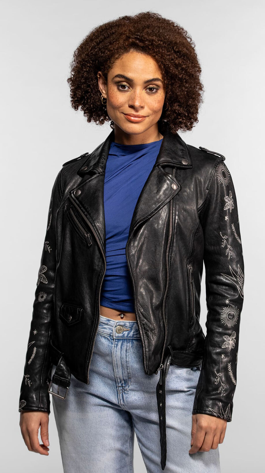 - Coupe Biker ajustée (Souligne la taille et structure la carrure).