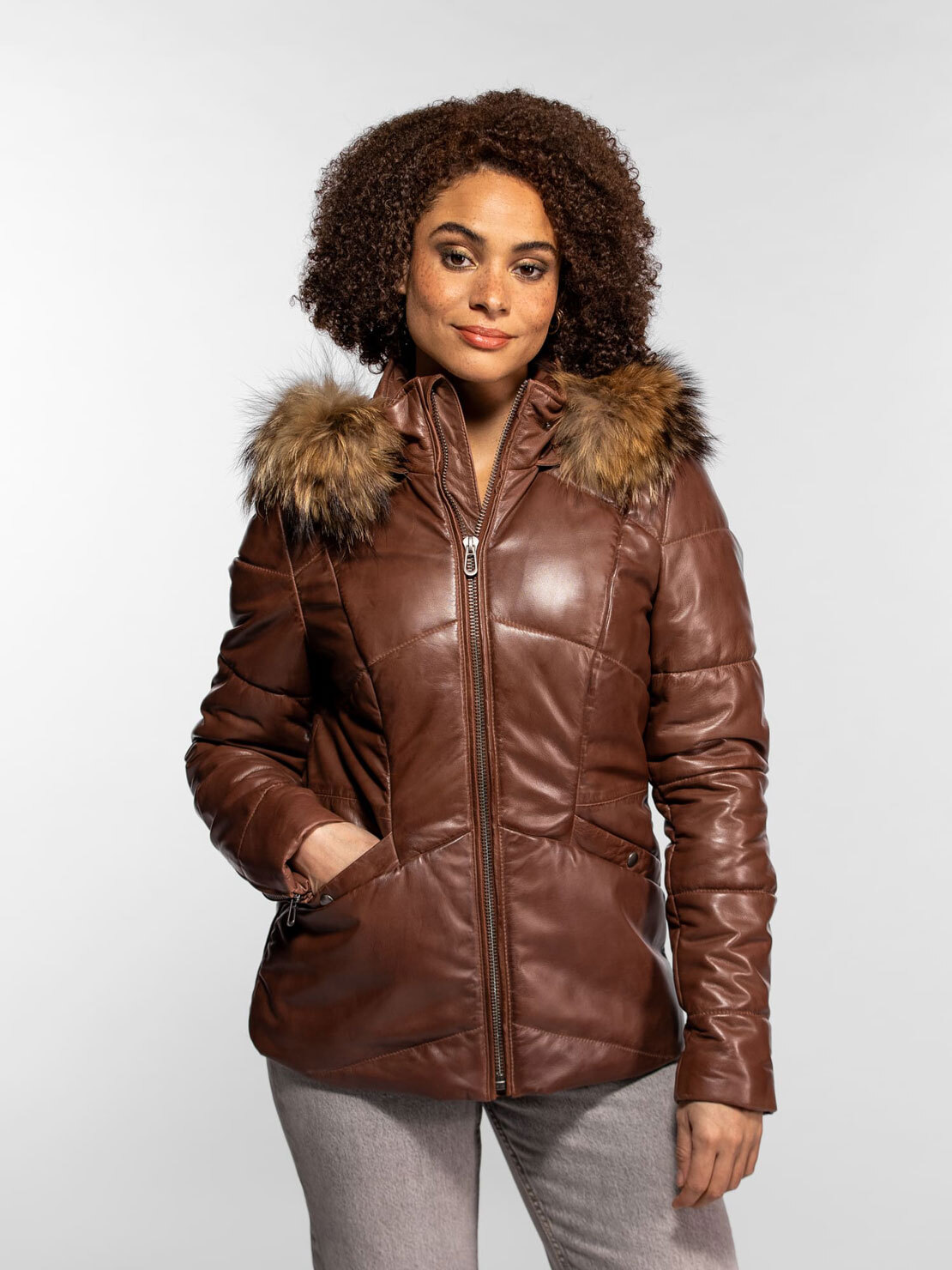 Doudoune cuir à capuche femme dark cognac Rose Garden